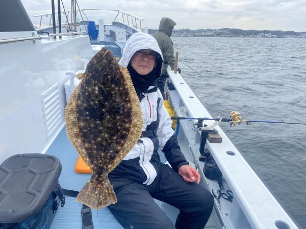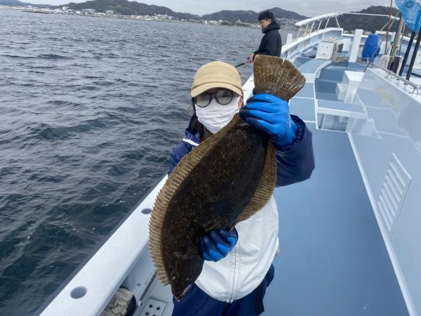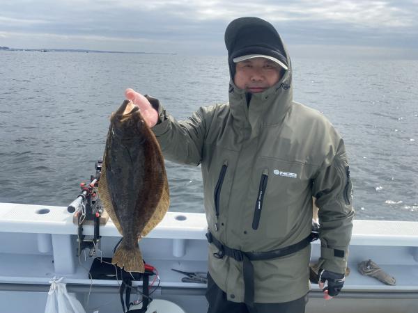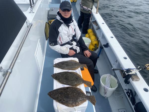本日も、ご乗船有難う御座いました。今日は、朝のうちは予報にはなかったような冷たい雨でお客様の声は、寒い寒いの一言で寒さ厳しく辛かったでしょう。。。前半は寒いしアタリないしの拷問でしたね。。。空も暗く、おまけに水色も暗く、、、。。。ヒラメファーストヒットは9時過ぎにゲットでき、それから空もだんだんと明るくなってからアタリ出始めてくれて、ヒラメ最大2キロ上がりトップ3枚で4名様で6枚と皆様全員様ゲットできアタリ出てくれました!!水色も若干明るく透明度高くなってきてくれたので、明日もこれに期待していきましょう!!明日17日(火)もお座席空席多数御座います。皆様からのご予約お問い合わせ・ネットご予約お待ちしております。